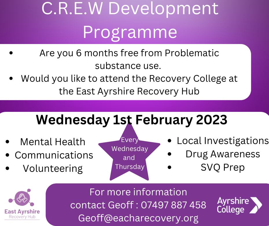 East Ayrshire Recovery College – C.R.E.W Development Programme will be starting the second part of the Recovery College at East Ayrshire Recovery Hub on Wednesday 1 February 2022.