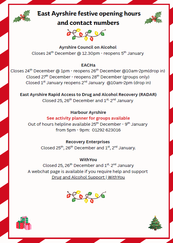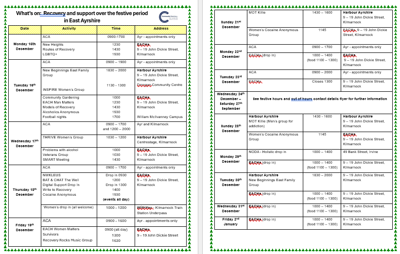 East Ayrshire Alcohol and Drug Partnership have produced documents to provide information on services open over the Christmas and New Year period.