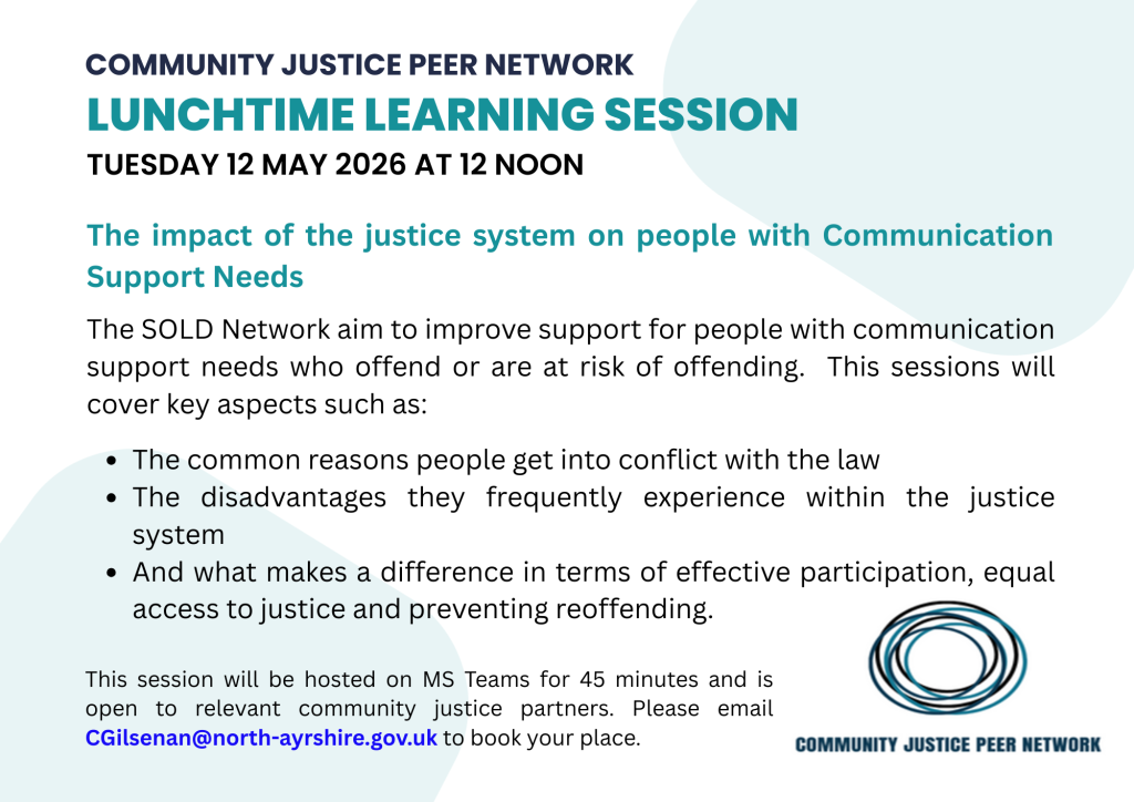 The Community Justice Peer Network are hosting a series of Lunchtime Learning session on MS Teams.