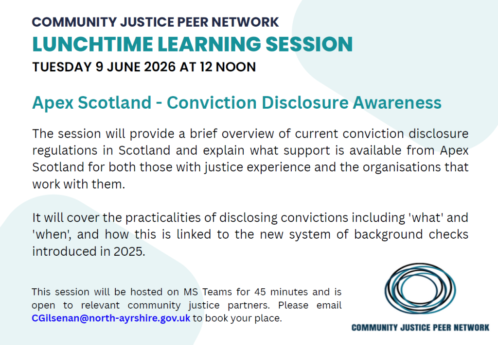 The Community Justice Peer Network are hosting a series of Lunchtime Learning session on MS Teams.
