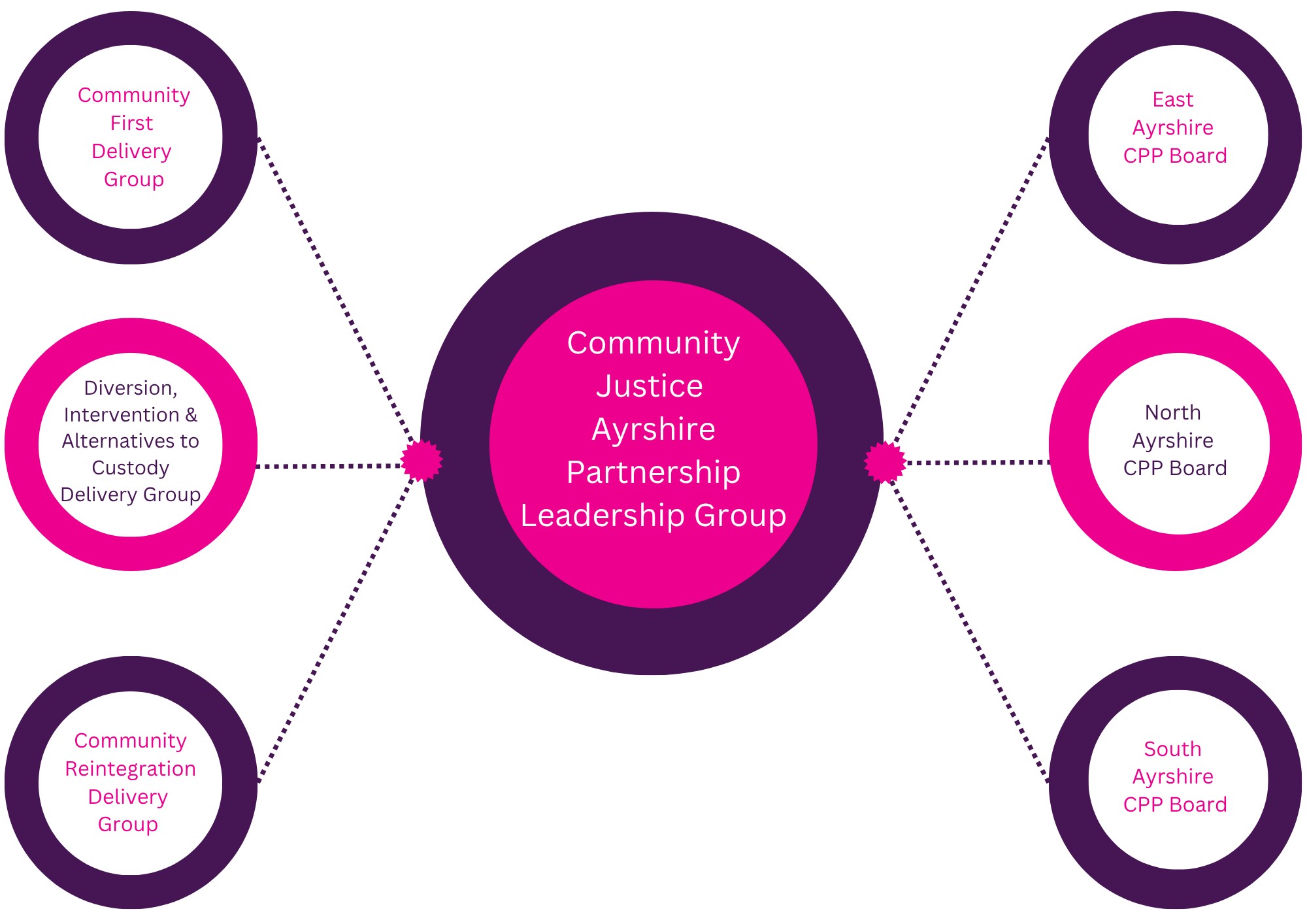 Three Community Justice Delivery Groups have been established to support the work of the Community Justice Ayrshire Partnership Leadership Group. A Diversion, Intervention and Alternatives to Custody Delivery Group, a Community Reintegration Delivery Group and a Community First Delivery Group. All the groups report into and are directed and overseen by the Community Justice Ayrshire Leadership Group.
